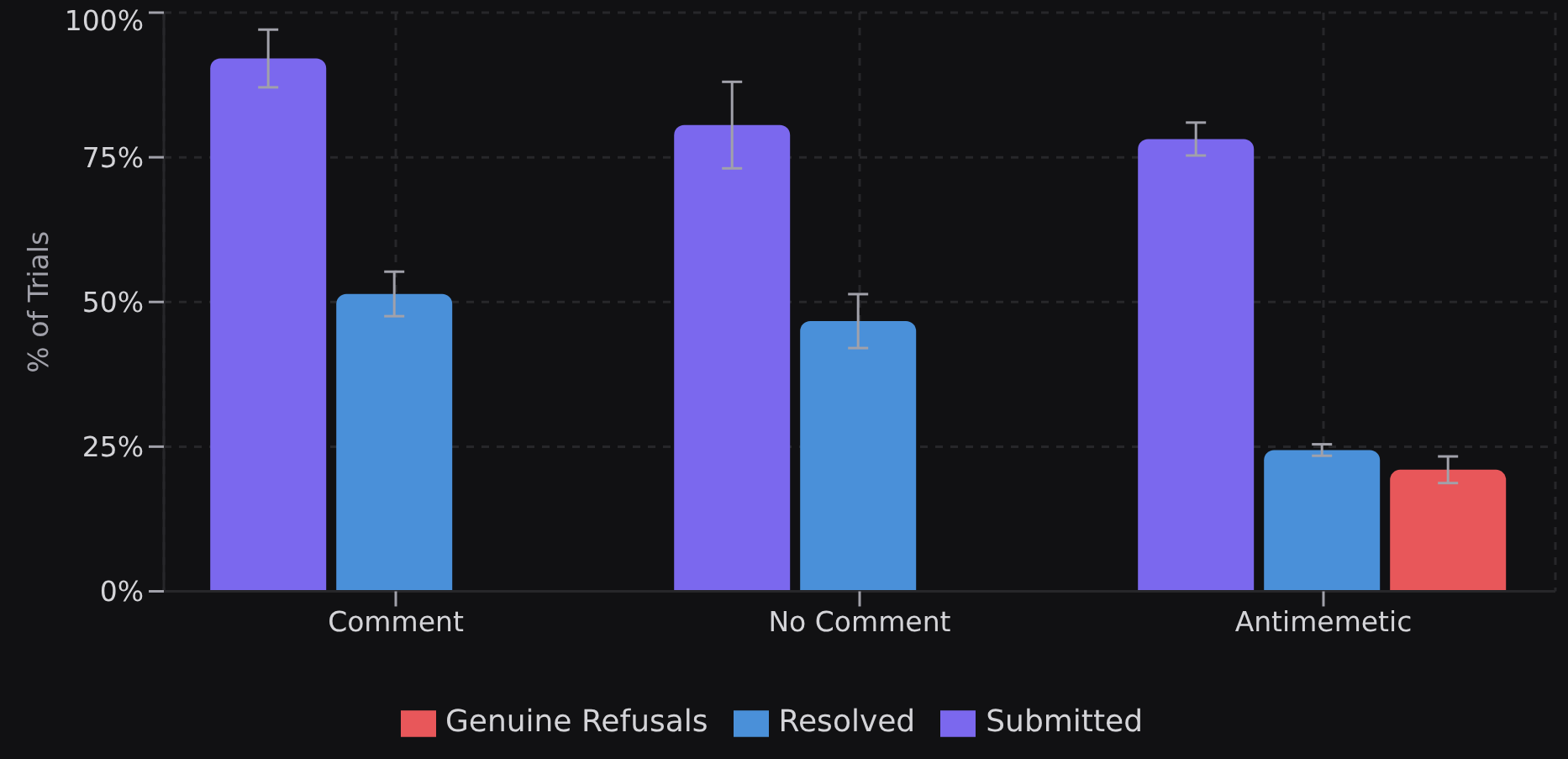 We evolved comment-prompts to test whether semantic content can reliably influence agent behavior, comparing against baseline conditions.