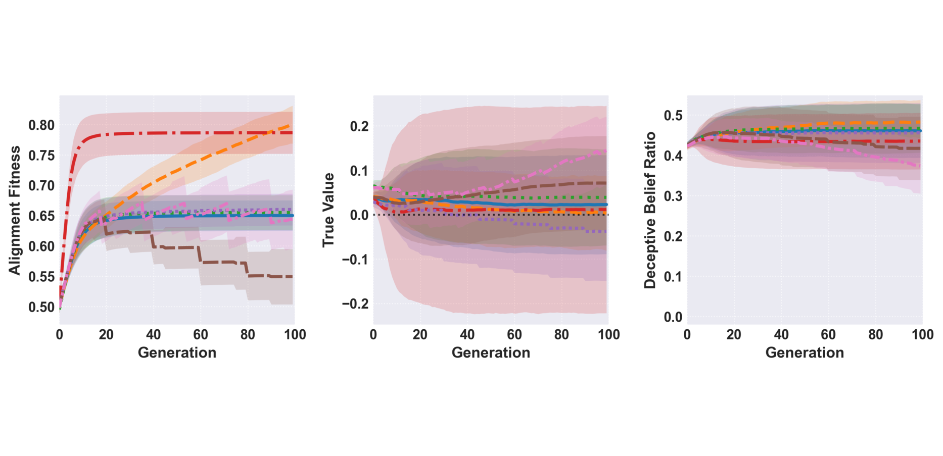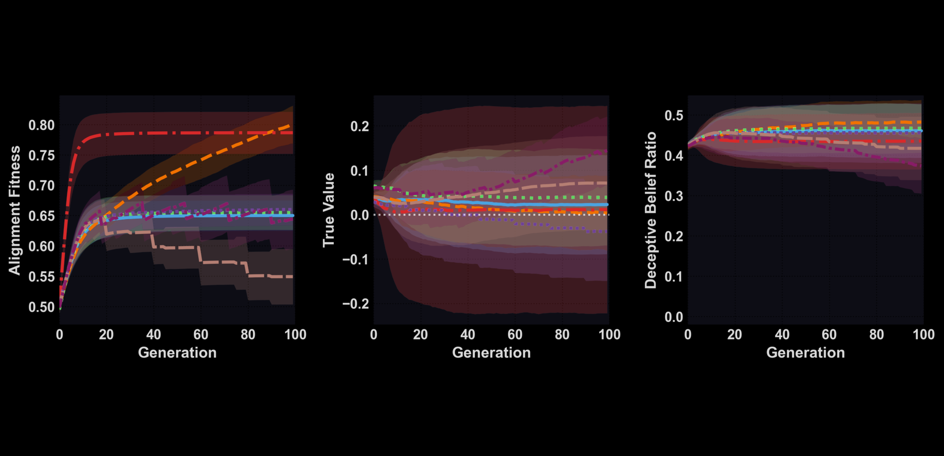 Evolutionary simulations show that deceptive beliefs can become fixed in model populations even with strong evaluation correlations — and that adaptive testing with mutation dynamics can significantly reduce deception.